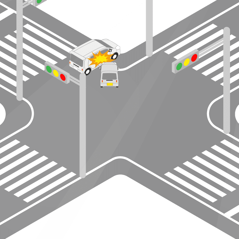 ・イラストに使用している各要素(車、背景、車、天候、信号、衝突地点など)は、代表的なイメージをイラスト化しており、色や形状等含め現実の事故の状況とは異なります。あくまで、事故のイメージとして参考までにご活用ください。