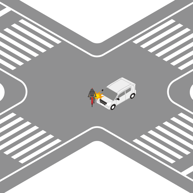 ・イラストに使用している各要素(車、背景、車、天候、信号、衝突地点など)は、代表的なイメージをイラスト化しており、色や形状等含め現実の事故の状況とは異なります。あくまで、事故のイメージとして参考までにご活用ください。