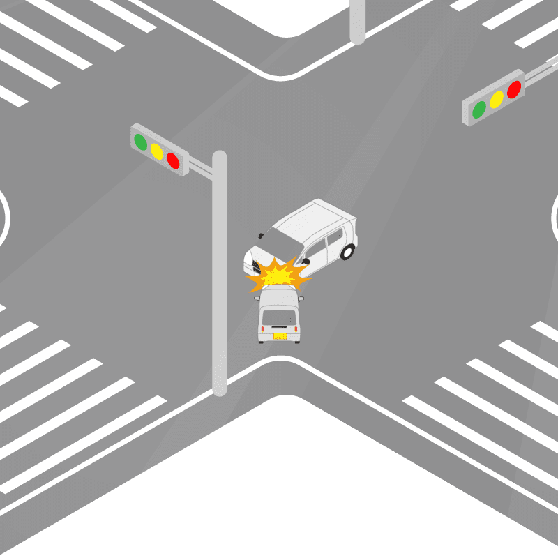 ・イラストに使用している各要素(車、背景、車、天候、信号、衝突地点など)は、代表的なイメージをイラスト化しており、色や形状等含め現実の事故の状況とは異なります。あくまで、事故のイメージとして参考までにご活用ください。