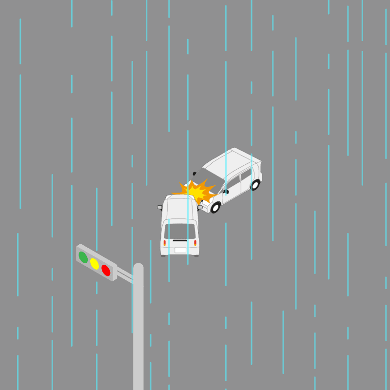 ・イラストに使用している各要素(車、背景、車、天候、信号、衝突地点など)は、代表的なイメージをイラスト化しており、色や形状等含め現実の事故の状況とは異なります。あくまで、事故のイメージとして参考までにご活用ください。
