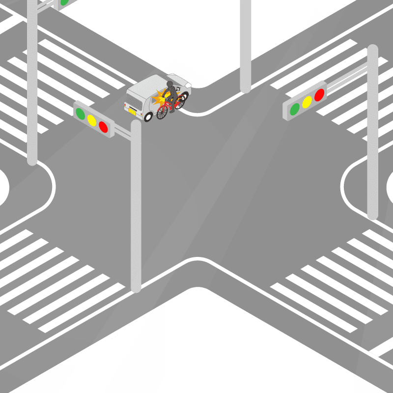 ・イラストに使用している各要素(車、背景、車、天候、信号、衝突地点など)は、代表的なイメージをイラスト化しており、色や形状等含め現実の事故の状況とは異なります。あくまで、事故のイメージとして参考までにご活用ください。