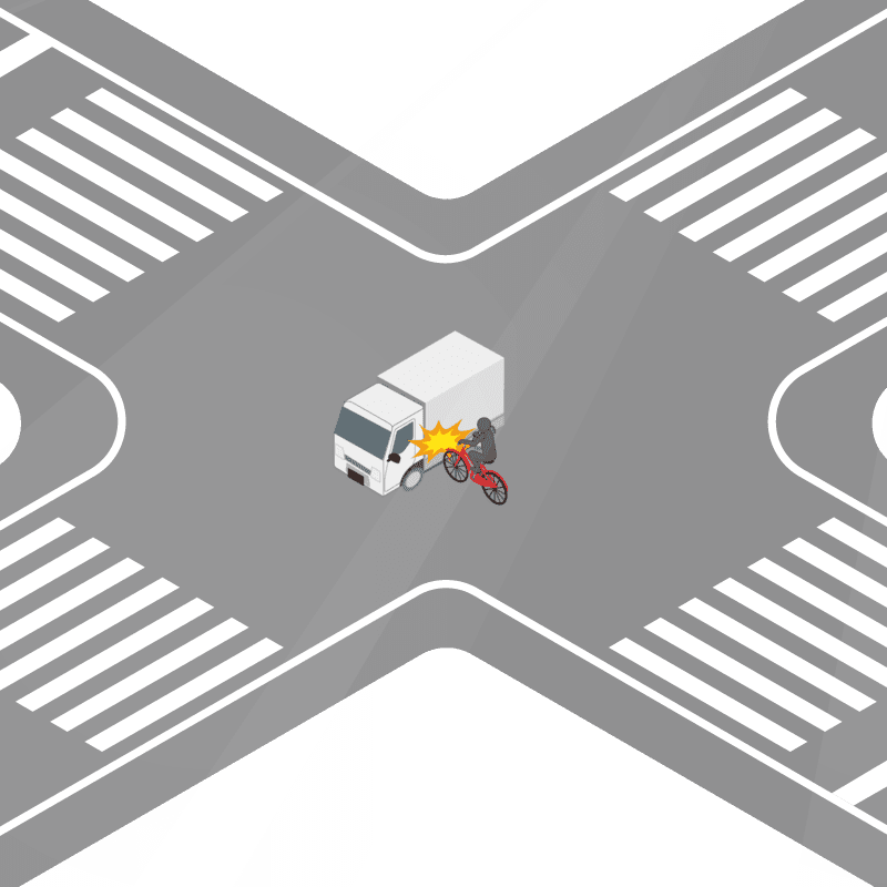 ・イラストに使用している各要素(車、背景、車、天候、信号、衝突地点など)は、代表的なイメージをイラスト化しており、色や形状等含め現実の事故の状況とは異なります。あくまで、事故のイメージとして参考までにご活用ください。