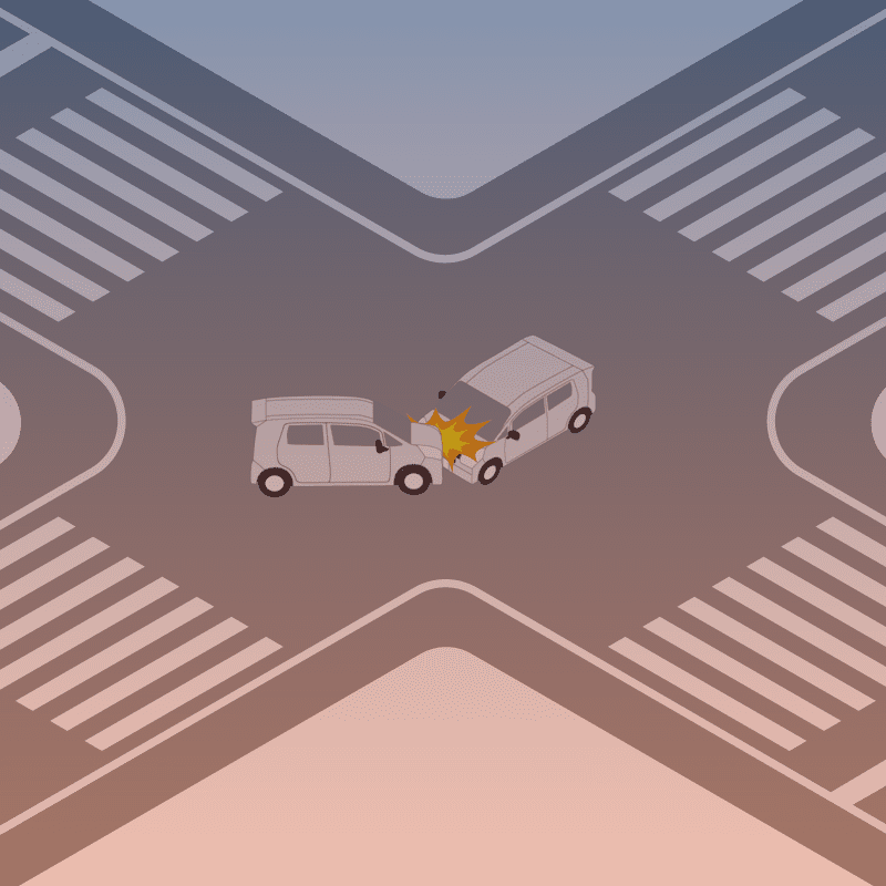 ・イラストに使用している各要素(車、背景、車、天候、信号、衝突地点など)は、代表的なイメージをイラスト化しており、色や形状等含め現実の事故の状況とは異なります。あくまで、事故のイメージとして参考までにご活用ください。