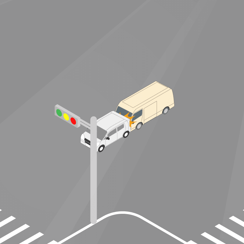 ・イラストに使用している各要素(車、背景、車、天候、信号、衝突地点など)は、代表的なイメージをイラスト化しており、色や形状等含め現実の事故の状況とは異なります。あくまで、事故のイメージとして参考までにご活用ください。