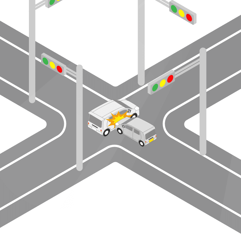 ・イラストに使用している各要素(車、背景、車、天候、信号、衝突地点など)は、代表的なイメージをイラスト化しており、色や形状等含め現実の事故の状況とは異なります。あくまで、事故のイメージとして参考までにご活用ください。