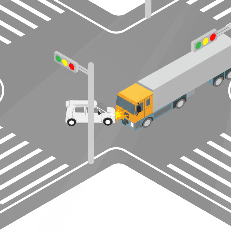 ・イラストに使用している各要素(車、背景、車、天候、信号、衝突地点など)は、代表的なイメージをイラスト化しており、色や形状等含め現実の事故の状況とは異なります。あくまで、事故のイメージとして参考までにご活用ください。