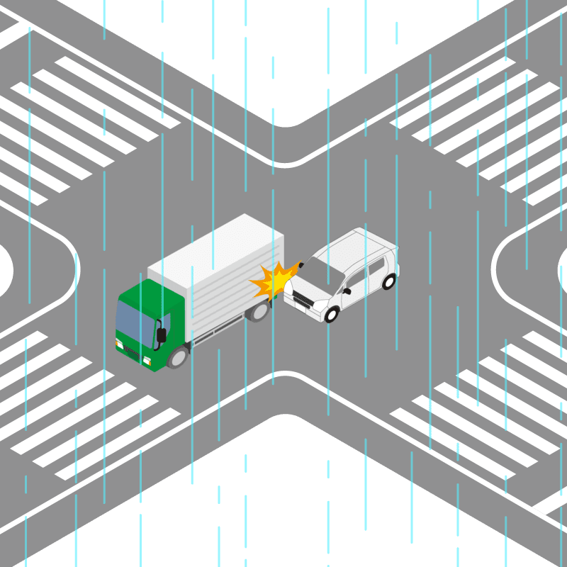 ・イラストに使用している各要素(車、背景、車、天候、信号、衝突地点など)は、代表的なイメージをイラスト化しており、色や形状等含め現実の事故の状況とは異なります。あくまで、事故のイメージとして参考までにご活用ください。