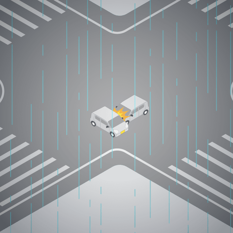 ・イラストに使用している各要素(車、背景、車、天候、信号、衝突地点など)は、代表的なイメージをイラスト化しており、色や形状等含め現実の事故の状況とは異なります。あくまで、事故のイメージとして参考までにご活用ください。