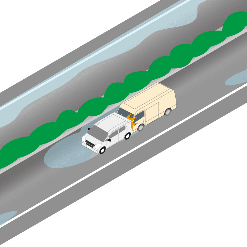 ・イラストに使用している各要素(車、背景、車、天候、信号、衝突地点など)は、代表的なイメージをイラスト化しており、色や形状等含め現実の事故の状況とは異なります。あくまで、事故のイメージとして参考までにご活用ください。