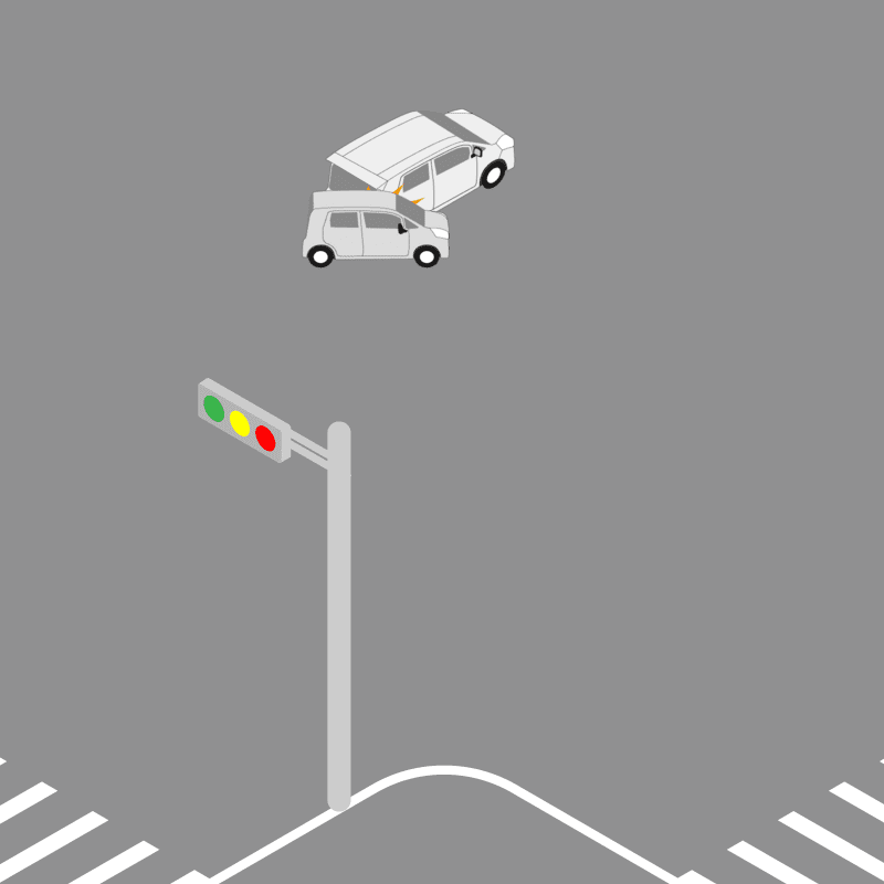 ・イラストに使用している各要素(車、背景、車、天候、信号、衝突地点など)は、代表的なイメージをイラスト化しており、色や形状等含め現実の事故の状況とは異なります。あくまで、事故のイメージとして参考までにご活用ください。