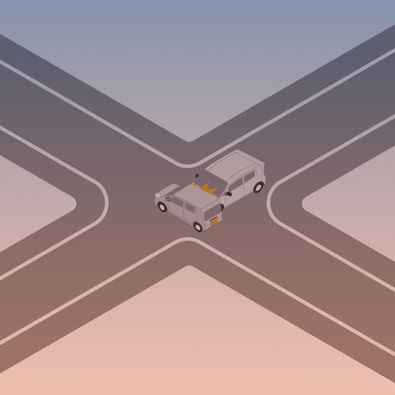 ・イラストに使用している各要素(車、背景、車、天候、信号、衝突地点など)は、代表的なイメージをイラスト化しており、色や形状等含め現実の事故の状況とは異なります。あくまで、事故のイメージとして参考までにご活用ください。