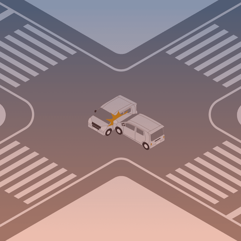 ・イラストに使用している各要素(車、背景、車、天候、信号、衝突地点など)は、代表的なイメージをイラスト化しており、色や形状等含め現実の事故の状況とは異なります。あくまで、事故のイメージとして参考までにご活用ください。