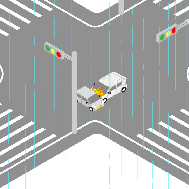 ・イラストに使用している各要素(車、背景、車、天候、信号、衝突地点など)は、代表的なイメージをイラスト化しており、色や形状等含め現実の事故の状況とは異なります。あくまで、事故のイメージとして参考までにご活用ください。