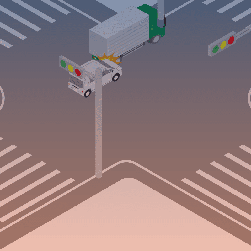 ・イラストに使用している各要素(車、背景、車、天候、信号、衝突地点など)は、代表的なイメージをイラスト化しており、色や形状等含め現実の事故の状況とは異なります。あくまで、事故のイメージとして参考までにご活用ください。