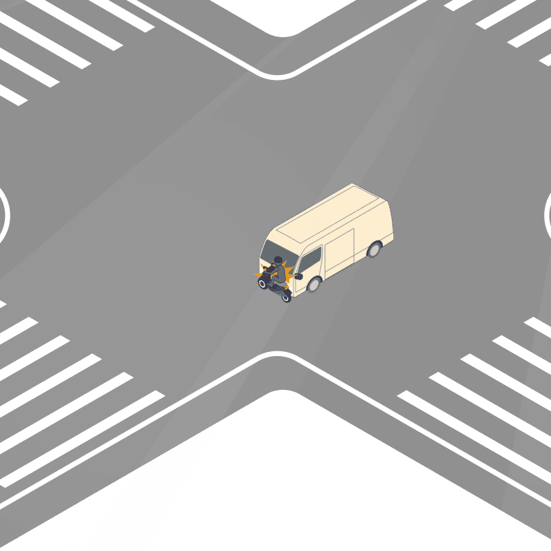 ・イラストに使用している各要素(車、背景、車、天候、信号、衝突地点など)は、代表的なイメージをイラスト化しており、色や形状等含め現実の事故の状況とは異なります。あくまで、事故のイメージとして参考までにご活用ください。