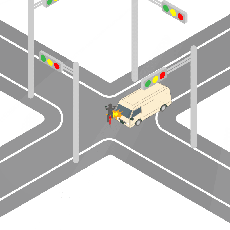 ・イラストに使用している各要素(車、背景、車、天候、信号、衝突地点など)は、代表的なイメージをイラスト化しており、色や形状等含め現実の事故の状況とは異なります。あくまで、事故のイメージとして参考までにご活用ください。
