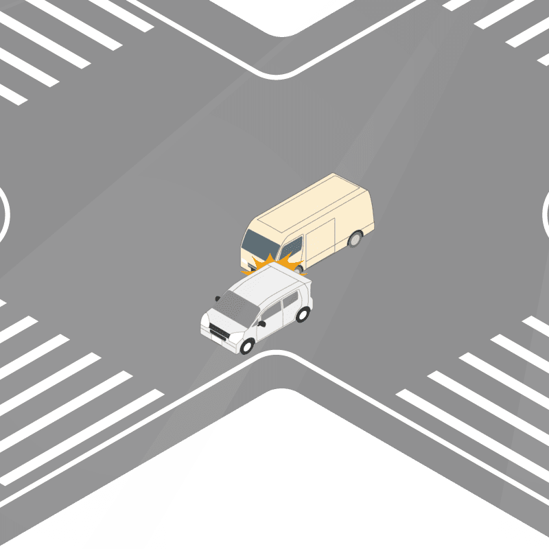 ・イラストに使用している各要素(車、背景、車、天候、信号、衝突地点など)は、代表的なイメージをイラスト化しており、色や形状等含め現実の事故の状況とは異なります。あくまで、事故のイメージとして参考までにご活用ください。