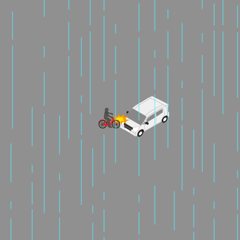 ・イラストに使用している各要素(車、背景、車、天候、信号、衝突地点など)は、代表的なイメージをイラスト化しており、色や形状等含め現実の事故の状況とは異なります。あくまで、事故のイメージとして参考までにご活用ください。
