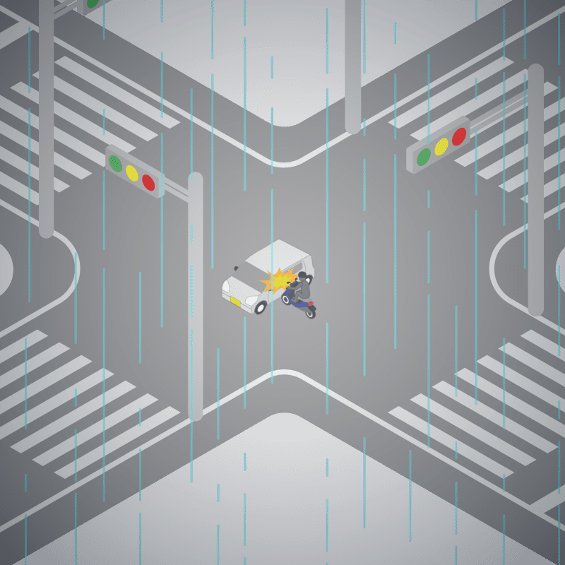 ・イラストに使用している各要素(車、背景、車、天候、信号、衝突地点など)は、代表的なイメージをイラスト化しており、色や形状等含め現実の事故の状況とは異なります。あくまで、事故のイメージとして参考までにご活用ください。