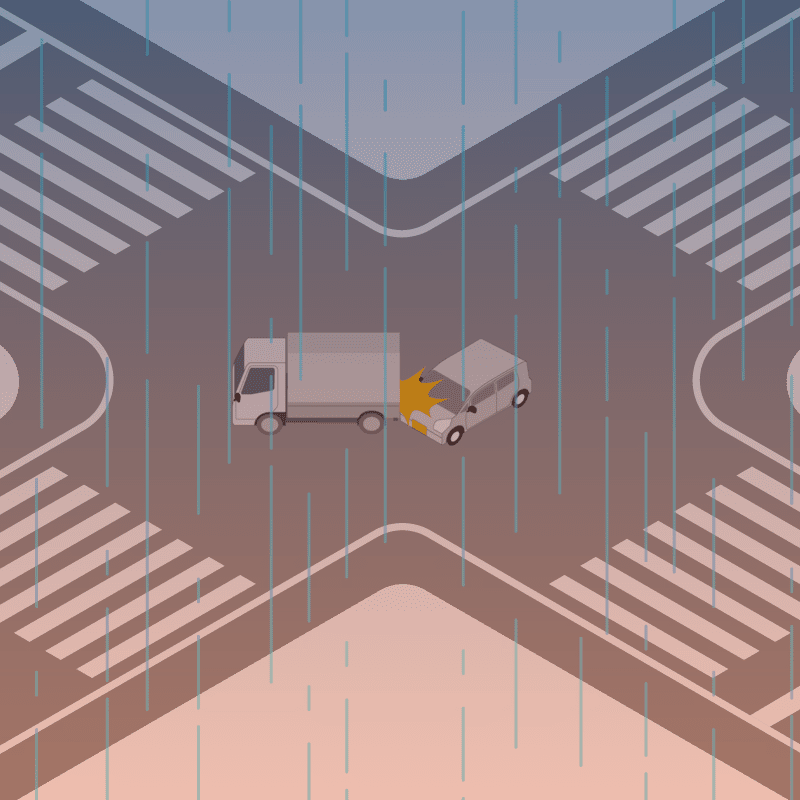 ・イラストに使用している各要素(車、背景、車、天候、信号、衝突地点など)は、代表的なイメージをイラスト化しており、色や形状等含め現実の事故の状況とは異なります。あくまで、事故のイメージとして参考までにご活用ください。
