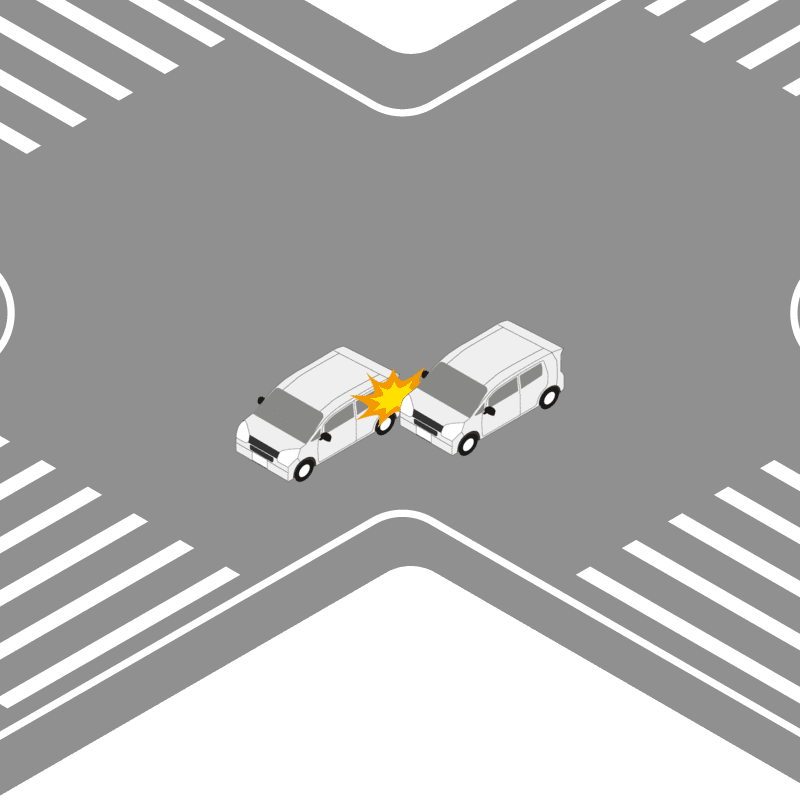 ・イラストに使用している各要素(車、背景、車、天候、信号、衝突地点など)は、代表的なイメージをイラスト化しており、色や形状等含め現実の事故の状況とは異なります。あくまで、事故のイメージとして参考までにご活用ください。