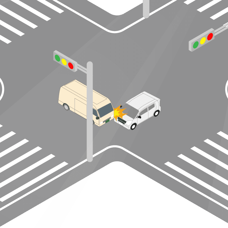 ・イラストに使用している各要素(車、背景、車、天候、信号、衝突地点など)は、代表的なイメージをイラスト化しており、色や形状等含め現実の事故の状況とは異なります。あくまで、事故のイメージとして参考までにご活用ください。