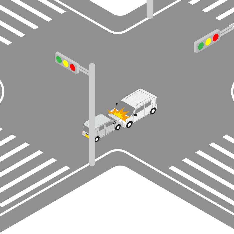 ・イラストに使用している各要素(車、背景、車、天候、信号、衝突地点など)は、代表的なイメージをイラスト化しており、色や形状等含め現実の事故の状況とは異なります。あくまで、事故のイメージとして参考までにご活用ください。