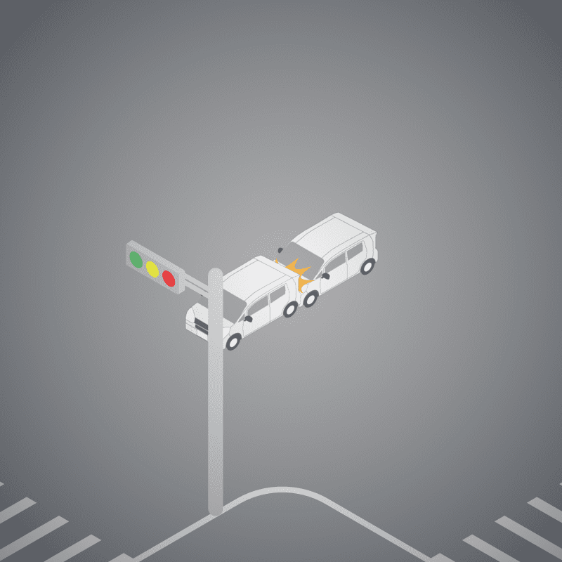 ・イラストに使用している各要素(車、背景、車、天候、信号、衝突地点など)は、代表的なイメージをイラスト化しており、色や形状等含め現実の事故の状況とは異なります。あくまで、事故のイメージとして参考までにご活用ください。