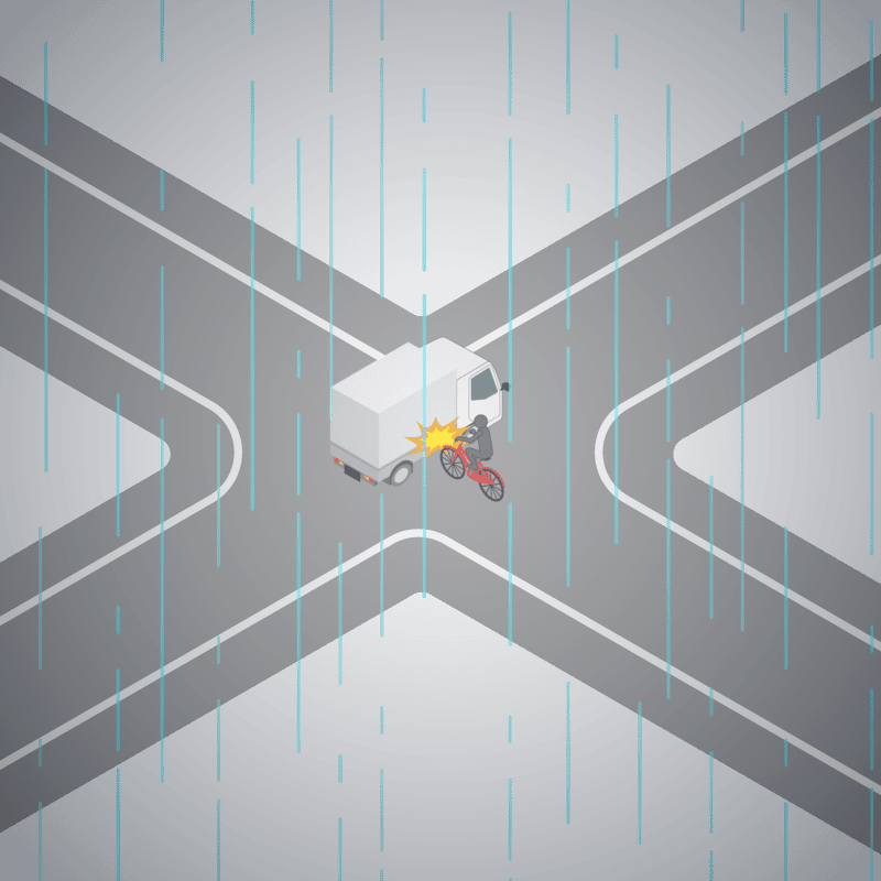 ・イラストに使用している各要素(車、背景、車、天候、信号、衝突地点など)は、代表的なイメージをイラスト化しており、色や形状等含め現実の事故の状況とは異なります。あくまで、事故のイメージとして参考までにご活用ください。