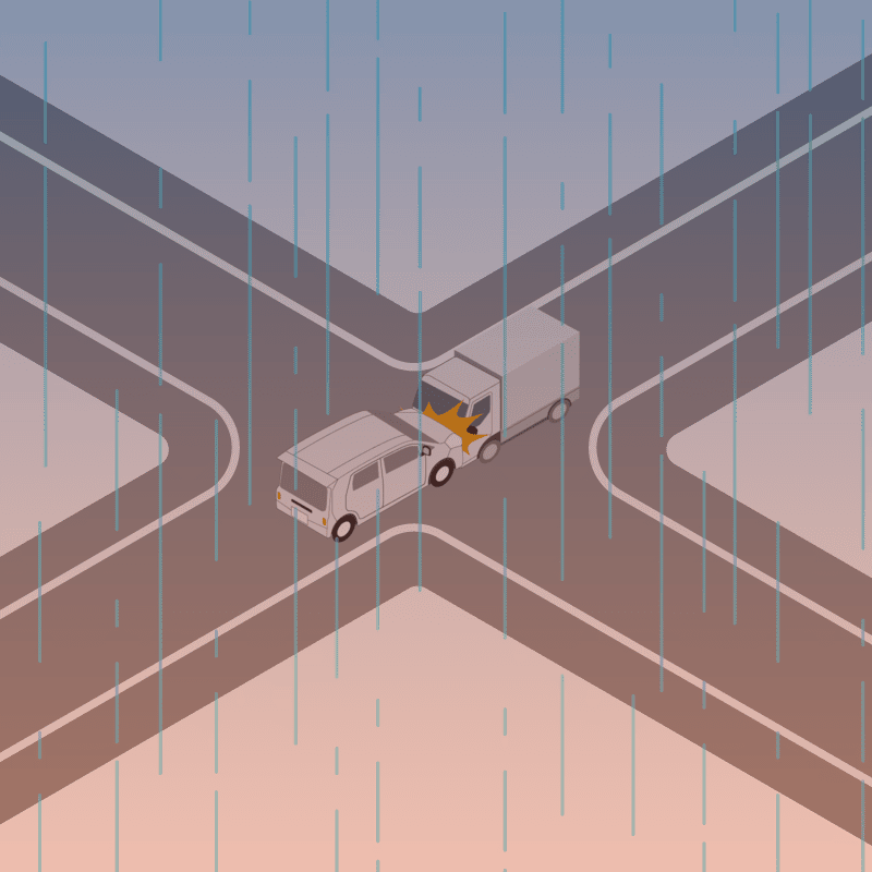 ・イラストに使用している各要素(車、背景、車、天候、信号、衝突地点など)は、代表的なイメージをイラスト化しており、色や形状等含め現実の事故の状況とは異なります。あくまで、事故のイメージとして参考までにご活用ください。