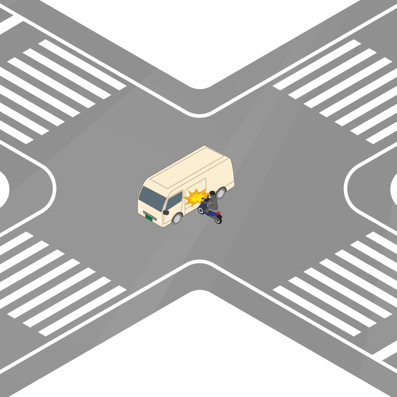 ・イラストに使用している各要素(車、背景、車、天候、信号、衝突地点など)は、代表的なイメージをイラスト化しており、色や形状等含め現実の事故の状況とは異なります。あくまで、事故のイメージとして参考までにご活用ください。