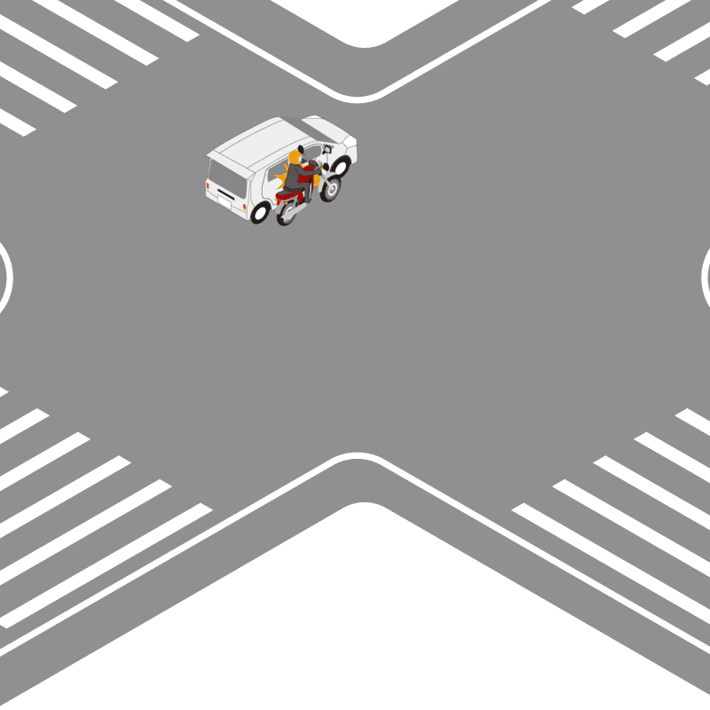 ・イラストに使用している各要素(車、背景、車、天候、信号、衝突地点など)は、代表的なイメージをイラスト化しており、色や形状等含め現実の事故の状況とは異なります。あくまで、事故のイメージとして参考までにご活用ください。