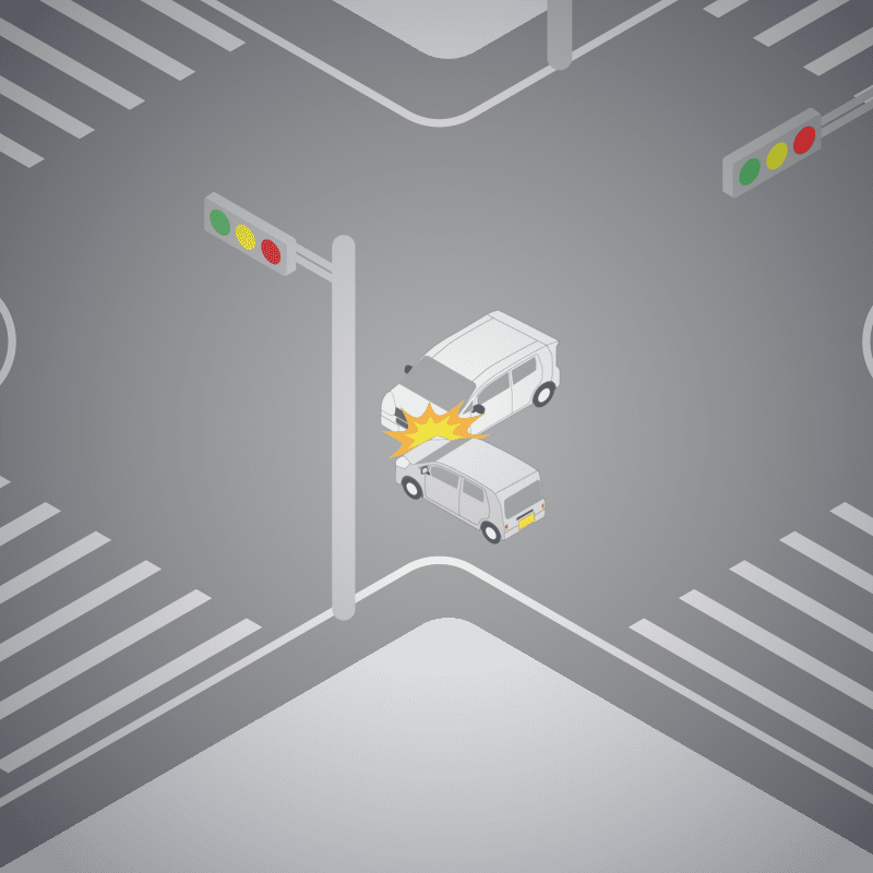 ・イラストに使用している各要素(車、背景、車、天候、信号、衝突地点など)は、代表的なイメージをイラスト化しており、色や形状等含め現実の事故の状況とは異なります。あくまで、事故のイメージとして参考までにご活用ください。