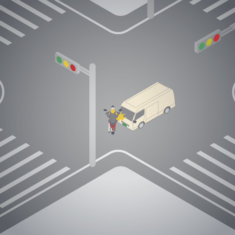 ・イラストに使用している各要素(車、背景、車、天候、信号、衝突地点など)は、代表的なイメージをイラスト化しており、色や形状等含め現実の事故の状況とは異なります。あくまで、事故のイメージとして参考までにご活用ください。