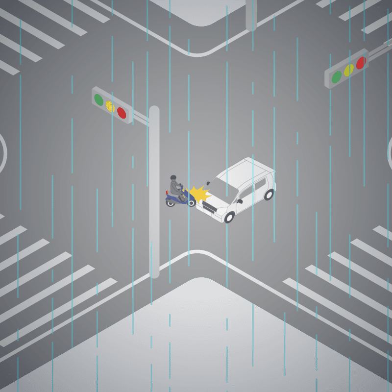 ・イラストに使用している各要素(車、背景、車、天候、信号、衝突地点など)は、代表的なイメージをイラスト化しており、色や形状等含め現実の事故の状況とは異なります。あくまで、事故のイメージとして参考までにご活用ください。
