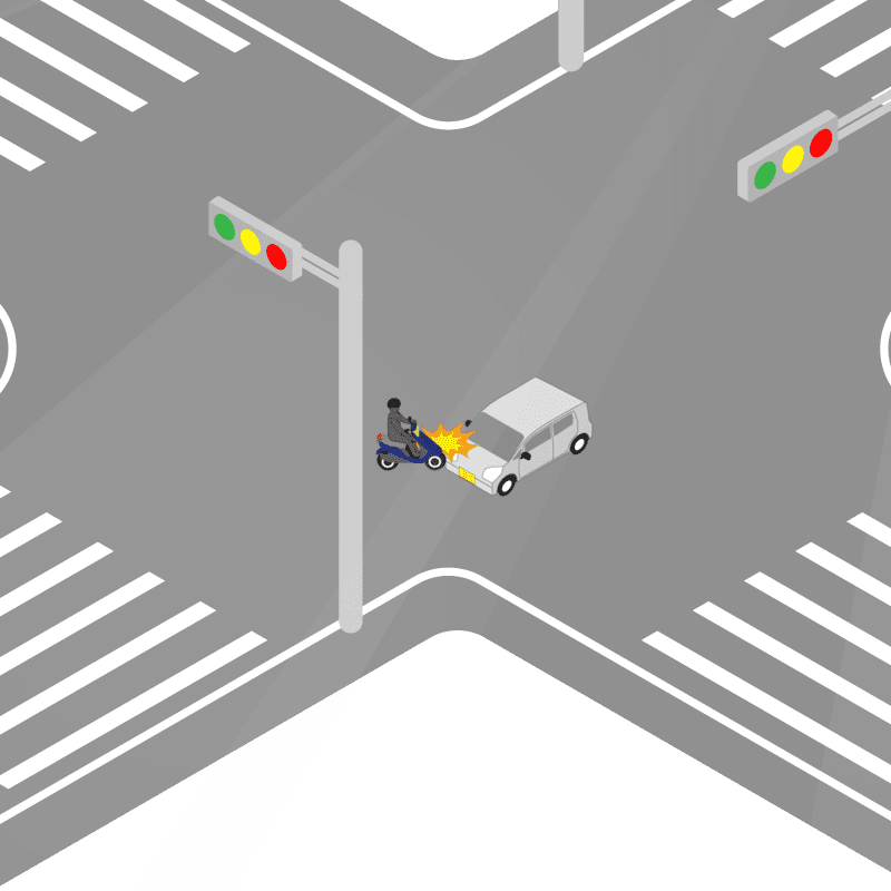 ・イラストに使用している各要素(車、背景、車、天候、信号、衝突地点など)は、代表的なイメージをイラスト化しており、色や形状等含め現実の事故の状況とは異なります。あくまで、事故のイメージとして参考までにご活用ください。