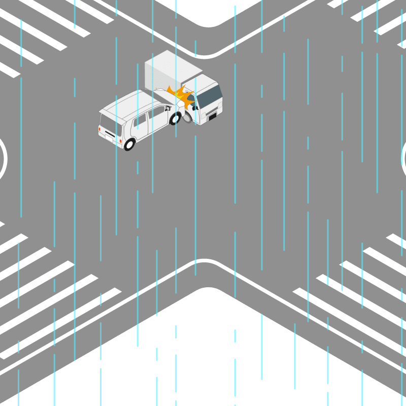 ・イラストに使用している各要素(車、背景、車、天候、信号、衝突地点など)は、代表的なイメージをイラスト化しており、色や形状等含め現実の事故の状況とは異なります。あくまで、事故のイメージとして参考までにご活用ください。