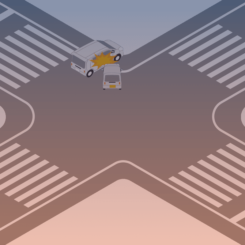 ・イラストに使用している各要素(車、背景、車、天候、信号、衝突地点など)は、代表的なイメージをイラスト化しており、色や形状等含め現実の事故の状況とは異なります。あくまで、事故のイメージとして参考までにご活用ください。