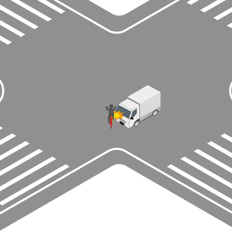 ・イラストに使用している各要素(車、背景、車、天候、信号、衝突地点など)は、代表的なイメージをイラスト化しており、色や形状等含め現実の事故の状況とは異なります。あくまで、事故のイメージとして参考までにご活用ください。