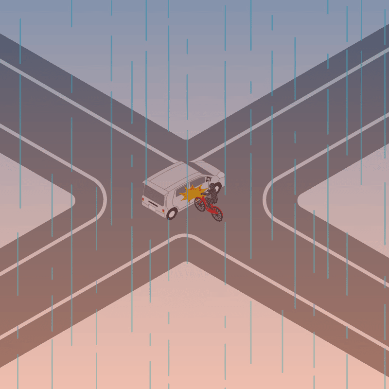 ・イラストに使用している各要素(車、背景、車、天候、信号、衝突地点など)は、代表的なイメージをイラスト化しており、色や形状等含め現実の事故の状況とは異なります。あくまで、事故のイメージとして参考までにご活用ください。