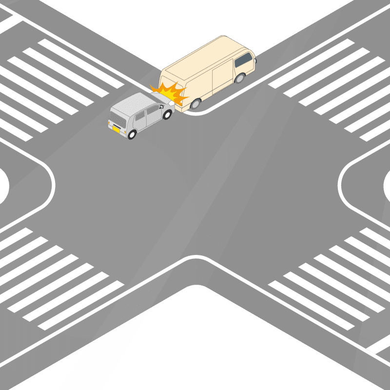 ・イラストに使用している各要素(車、背景、車、天候、信号、衝突地点など)は、代表的なイメージをイラスト化しており、色や形状等含め現実の事故の状況とは異なります。あくまで、事故のイメージとして参考までにご活用ください。
