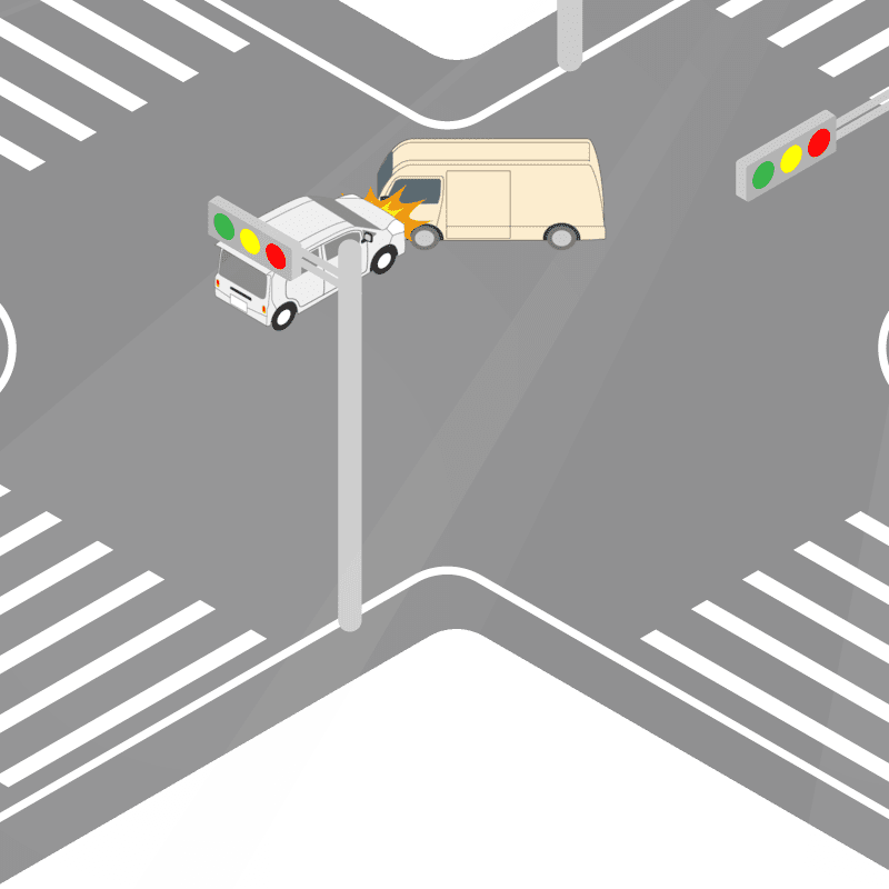 ・イラストに使用している各要素(車、背景、車、天候、信号、衝突地点など)は、代表的なイメージをイラスト化しており、色や形状等含め現実の事故の状況とは異なります。あくまで、事故のイメージとして参考までにご活用ください。