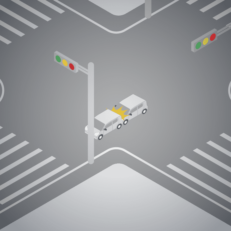 ・イラストに使用している各要素(車、背景、車、天候、信号、衝突地点など)は、代表的なイメージをイラスト化しており、色や形状等含め現実の事故の状況とは異なります。あくまで、事故のイメージとして参考までにご活用ください。