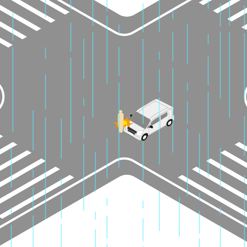 ・イラストに使用している各要素(車、背景、車、天候、信号、衝突地点など)は、代表的なイメージをイラスト化しており、色や形状等含め現実の事故の状況とは異なります。あくまで、事故のイメージとして参考までにご活用ください。