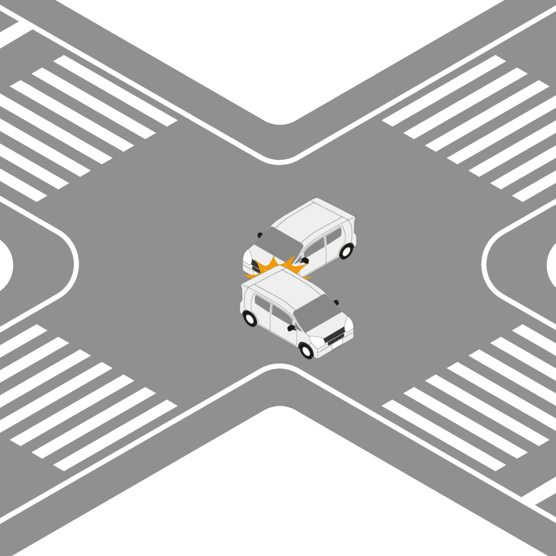・イラストに使用している各要素(車、背景、車、天候、信号、衝突地点など)は、代表的なイメージをイラスト化しており、色や形状等含め現実の事故の状況とは異なります。あくまで、事故のイメージとして参考までにご活用ください。