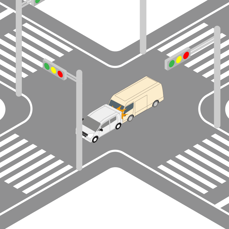 ・イラストに使用している各要素(車、背景、車、天候、信号、衝突地点など)は、代表的なイメージをイラスト化しており、色や形状等含め現実の事故の状況とは異なります。あくまで、事故のイメージとして参考までにご活用ください。
