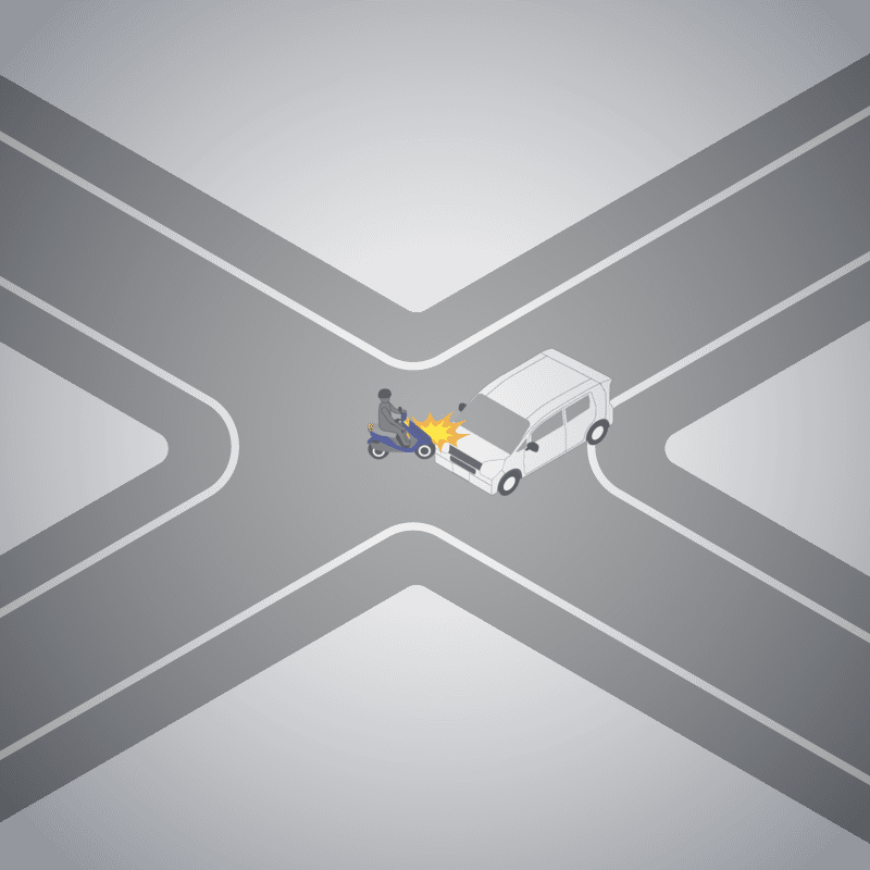 ・イラストに使用している各要素(車、背景、車、天候、信号、衝突地点など)は、代表的なイメージをイラスト化しており、色や形状等含め現実の事故の状況とは異なります。あくまで、事故のイメージとして参考までにご活用ください。