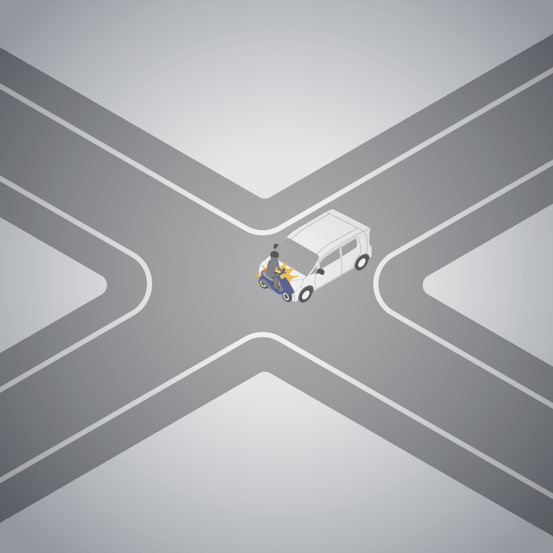 ・イラストに使用している各要素(車、背景、車、天候、信号、衝突地点など)は、代表的なイメージをイラスト化しており、色や形状等含め現実の事故の状況とは異なります。あくまで、事故のイメージとして参考までにご活用ください。