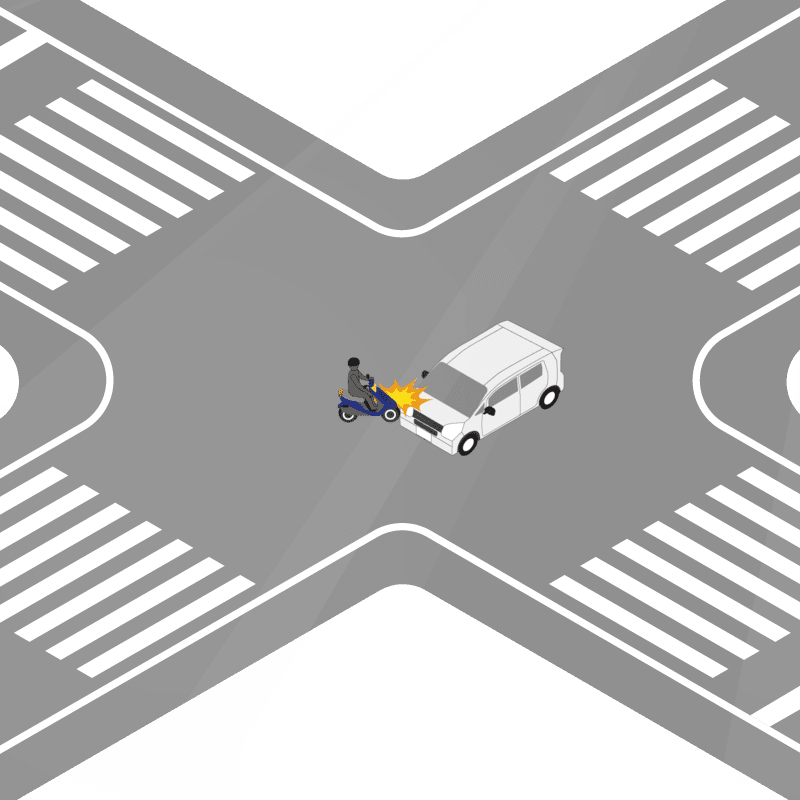 ・イラストに使用している各要素(車、背景、車、天候、信号、衝突地点など)は、代表的なイメージをイラスト化しており、色や形状等含め現実の事故の状況とは異なります。あくまで、事故のイメージとして参考までにご活用ください。