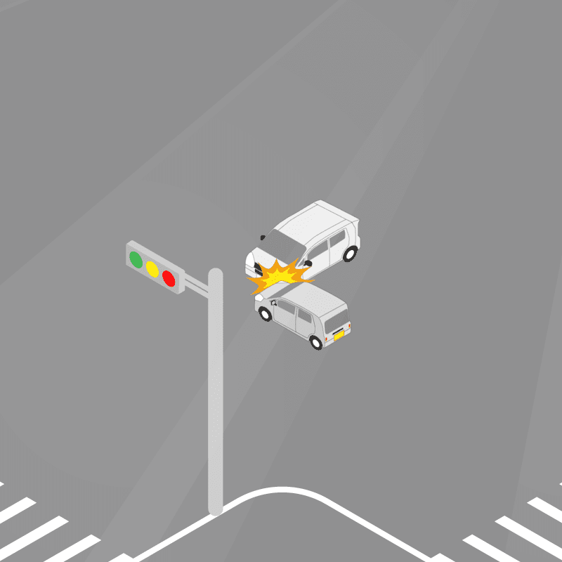 ・イラストに使用している各要素(車、背景、車、天候、信号、衝突地点など)は、代表的なイメージをイラスト化しており、色や形状等含め現実の事故の状況とは異なります。あくまで、事故のイメージとして参考までにご活用ください。